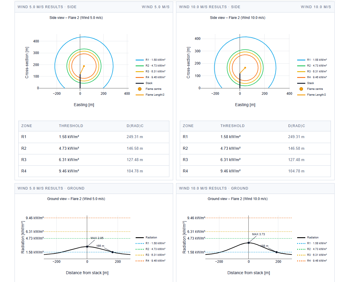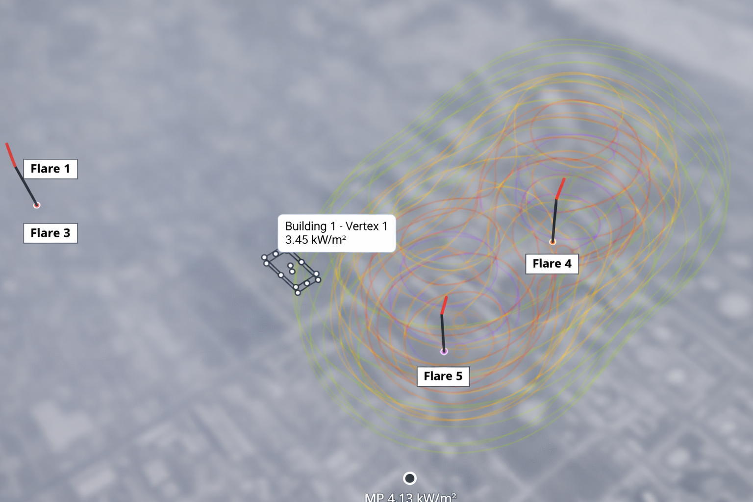 Ground-level thermal radiation and impact ranges from single (API Standard 521, 7th Edition (2020)) or multiple flares .